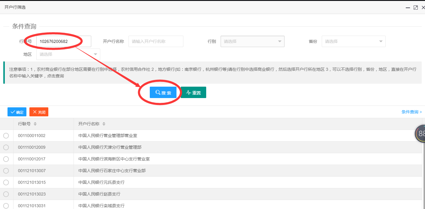 2.输入行联号查询。开户行联行号是一个地区银行的唯一识别标志,每一个银行支行有相应的开户行联行号。开户行联行号由12位组成:3位银行代码+4位城市代码+4位银行编号+1位校验位。开户行联行号查询方式:直接拨打银行服务热线,进行人工客服查询,或根据开户行网点在相应银行官网查询。