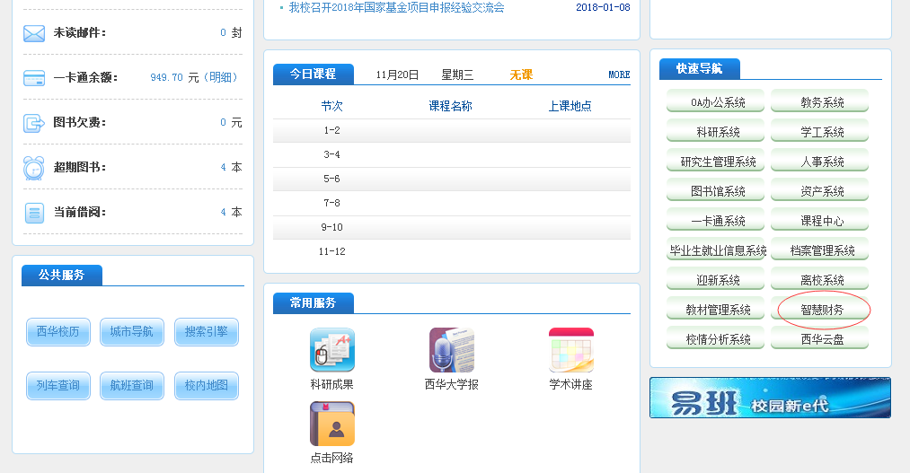 为了进一步提高奖助金发放、教材费结算等款项银行转账上卡的准确性和及时性,请通知学生在2020年11月10日——22日通过ok138cn太阳集团529主页(http://www.xhu.edu.cn)进入“信息门户”(http://urp.xhu.edu.cn),点击右偏下“快速导航”板块下的“智慧财务”,进入云杰URP系统,在线核实添加学生本人准确的银行卡账号及相关信息。具体的操作流程详见附件的第一部分。