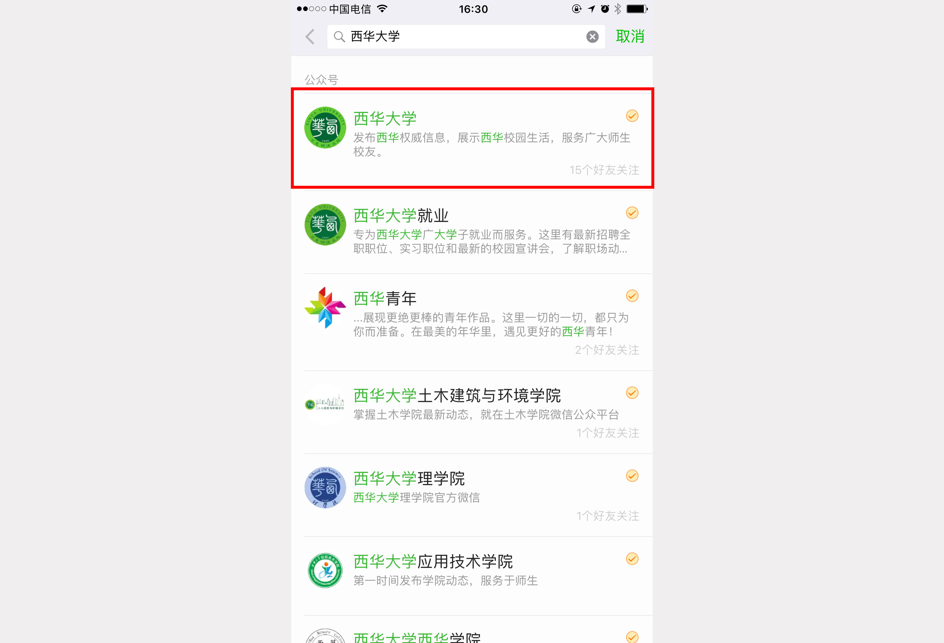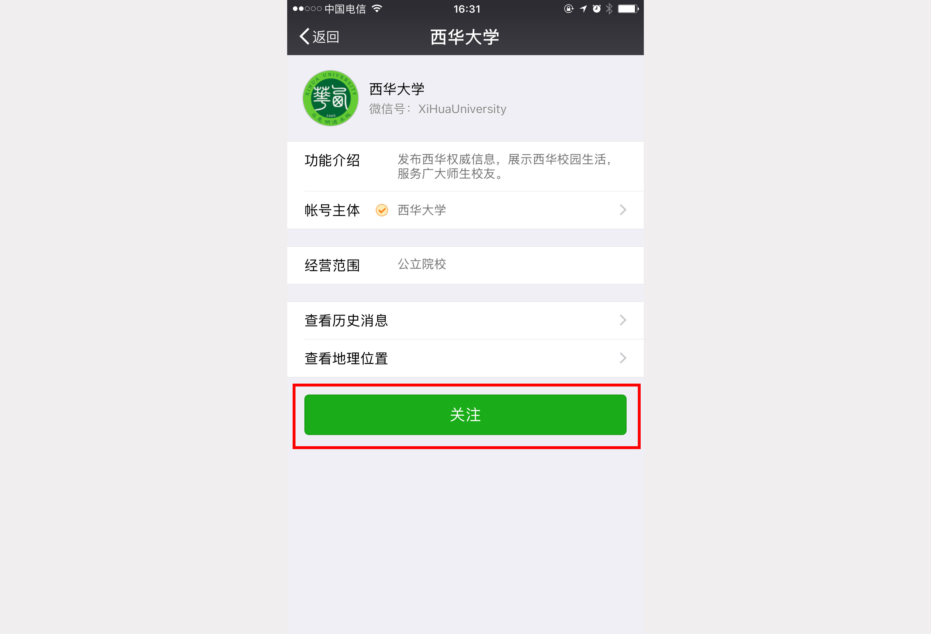 1.3、 点击关注按钮,关注学校公众号