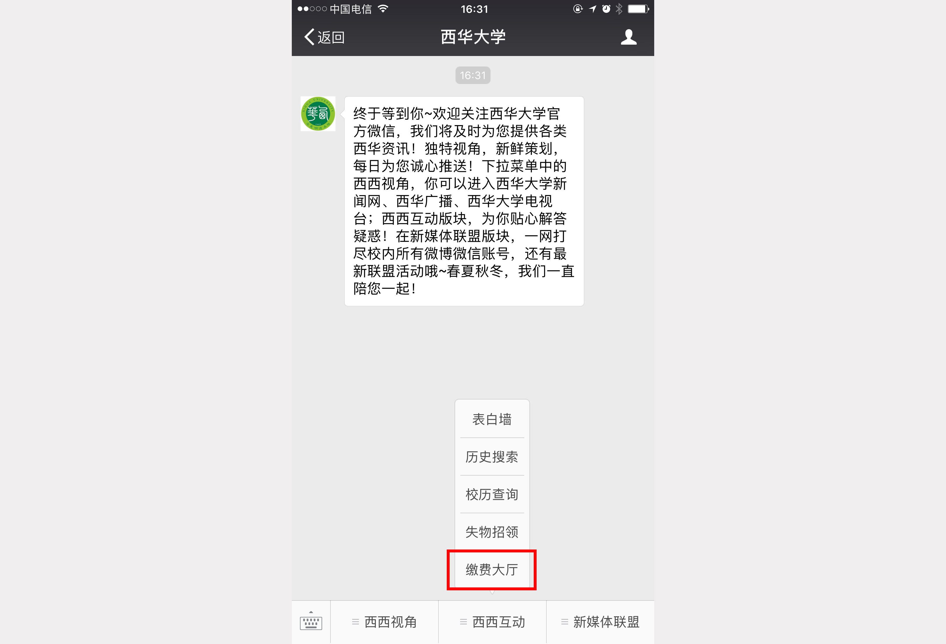 1.4.进入公众号主界面,点击菜单进入“西西互动”“缴费大厅”