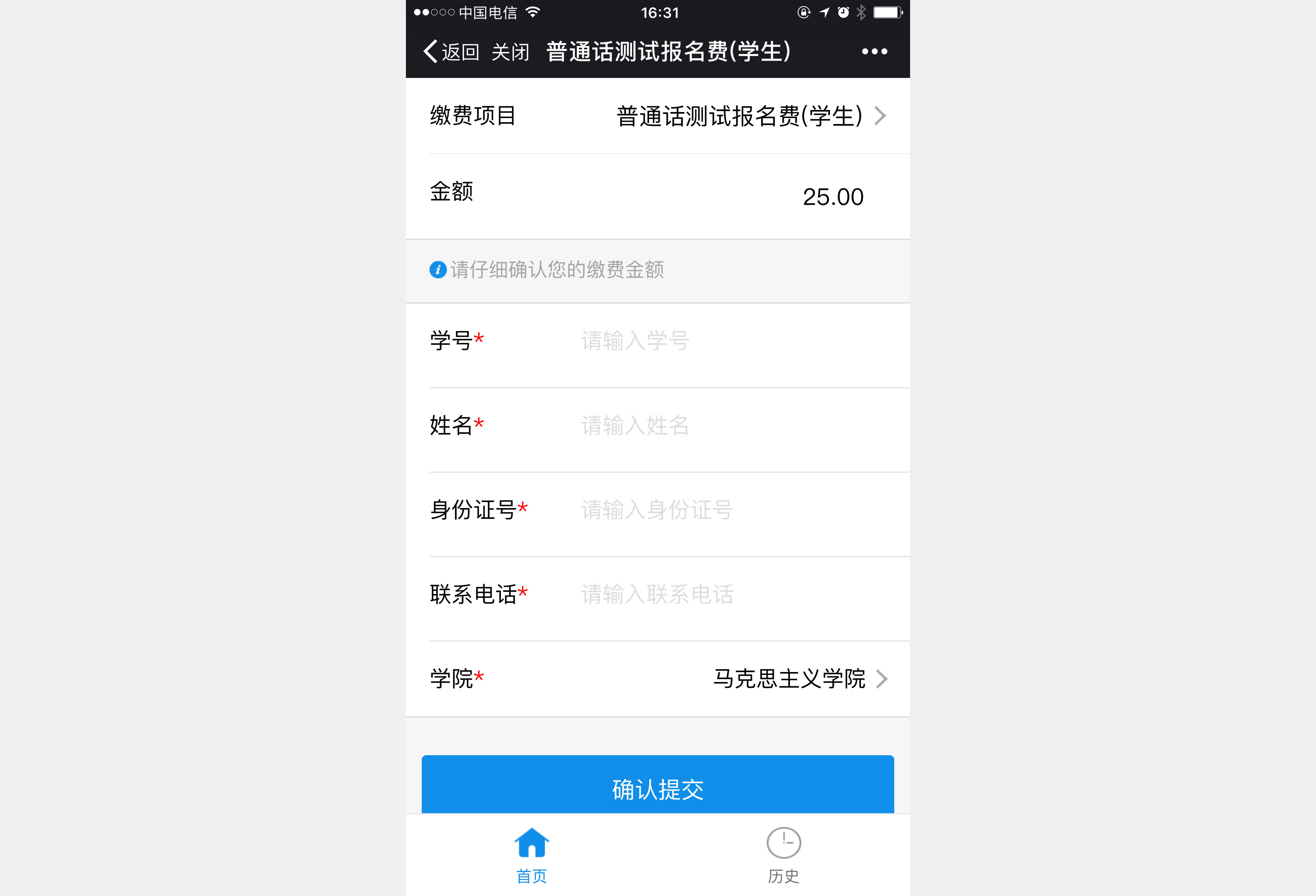 2.3、 进入缴费界面后,填写缴费金额与缴费人信息,确认无误后点击“确认提交”,完成支付操作